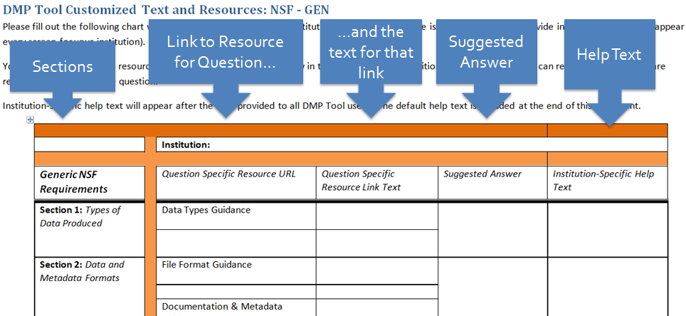 The DMPTool comes pre-populated with funder-provided information on how to construct a data management plan. Customizing the tool gives you a chance to modify what grant writers see when using the tool. Broken up into separate sections, administrators can provide help text, suggested answers, contacts at the institution, and resource links such as best practices guides or support groups.