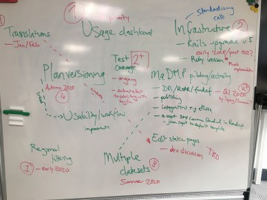 Over the three days we had a mix of group discussions to plan the future development roadmap (results of that later), as well as developer / project manager sessions and discussions with the wider DCC and CDL team on machine-actionable DMPs. Below we report out on the results of our sessions and the future development roadmap